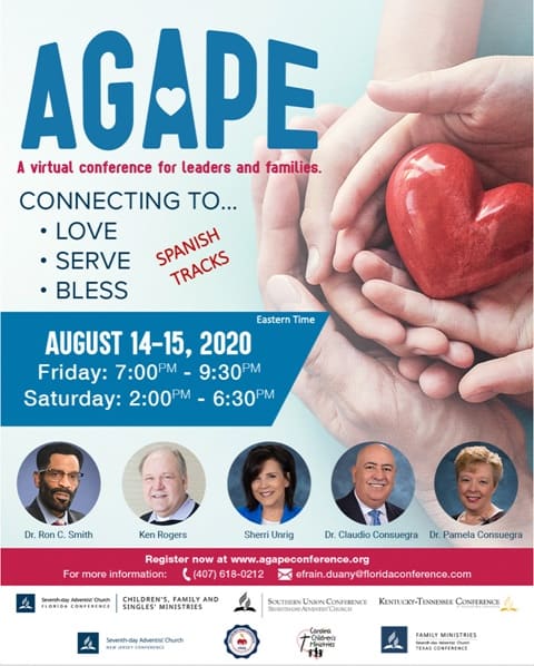 Let’s talk about Agape, the first Virtual Family Conference. Indeed, the Ontario Conference Family Ministries team joined with other Conferences in the North American Division to sponsor the event. Hence, presenters from Texas and other parts of the United States will offer over 100 free virtual seminars for leaders and families. For example, keynotes speakers such as Dr. Ron Smith, Ken Rogers, Dr. Consuegra, and others will present the plenary sessions. The conference will take place on August 14-15. Additionally, registration is free and at www.agapeconference.org.
