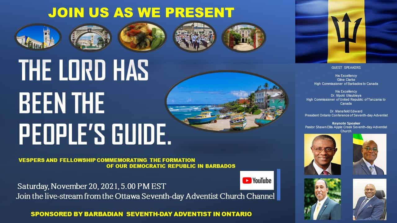 In the interest of recognizing the diversity that resides within all our congregations, The Barbadian Adventist Community in Ontario would like to invite you and your congregation, to a special worship service on November 20 at 5:00 pm, celebrating the 55th independence anniversary of the nation of Barbados. The theme of the evening of worship is “ The Lord Has Been the People’s Guide”.