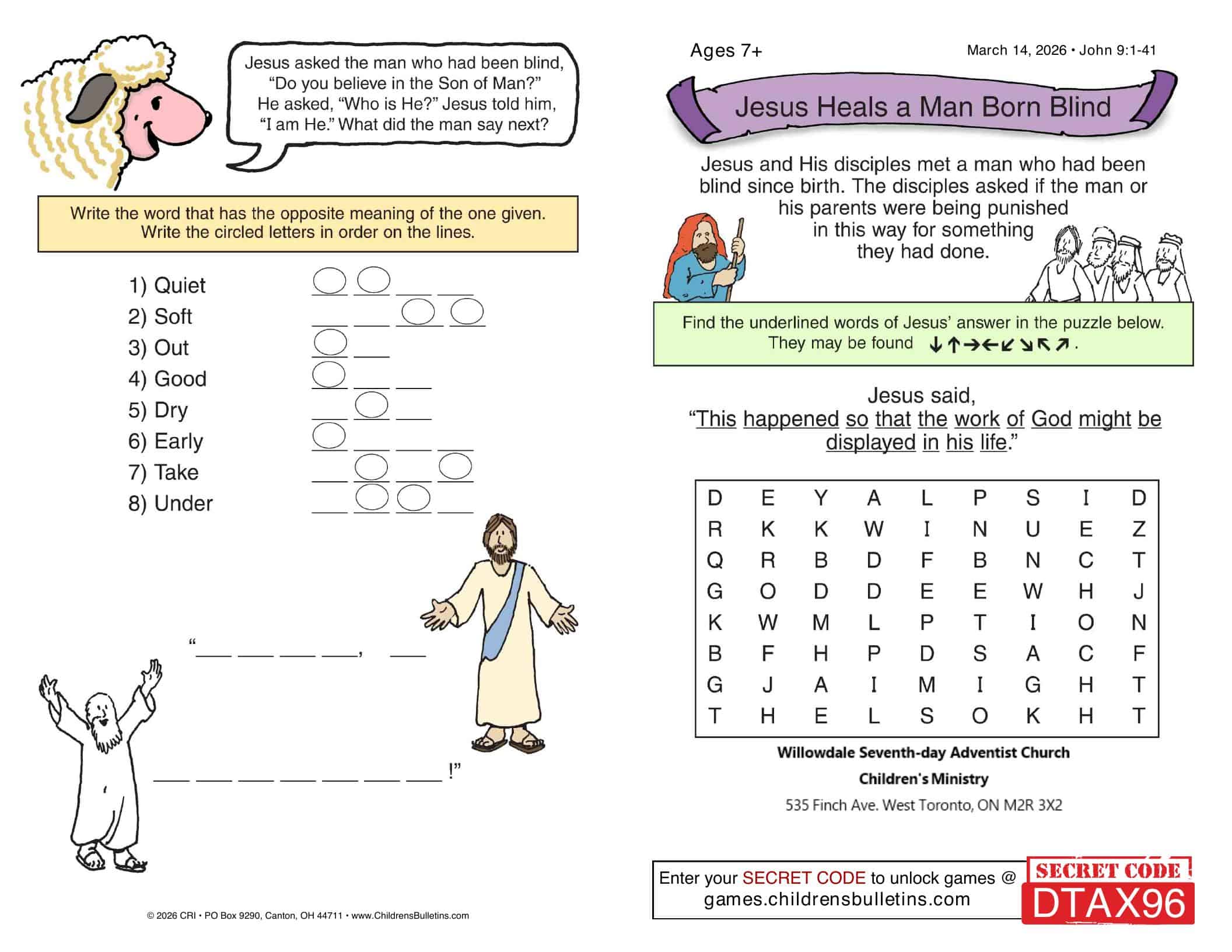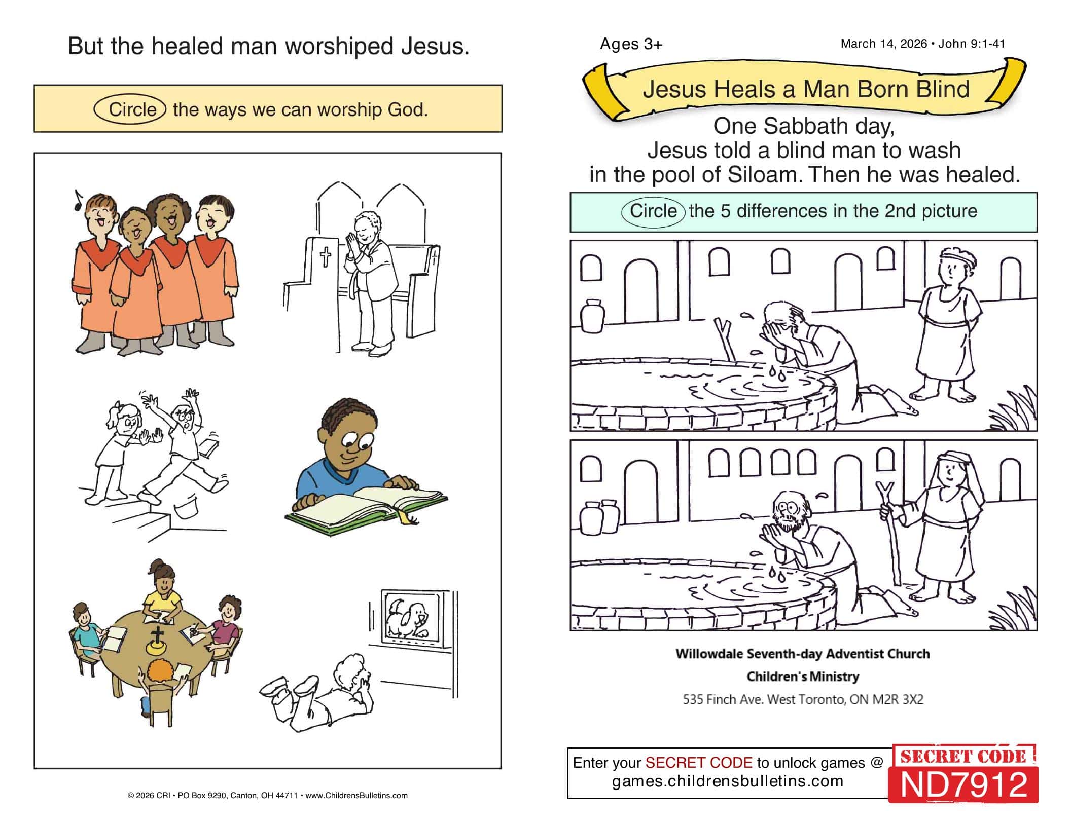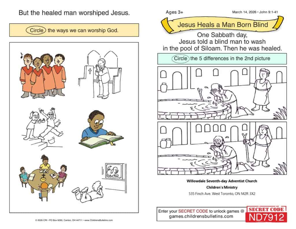 Children’s Worship Bulletins – Sabbath, March 14, 2026