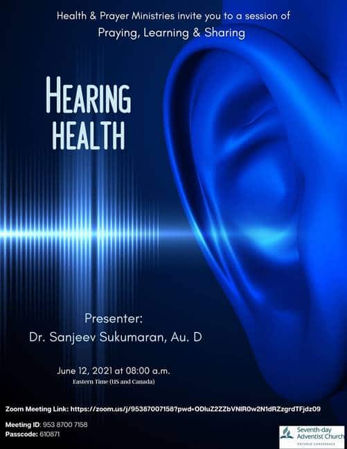 Maria McClean invites us to a session of praying and sharing. Indeed, the director of Health and Prayer Ministries at the Conference is organizing this recurring meeting. Each session takes place on Sabbath, from 8:00 AM to 9:00 AM. This week will be a presentation by Dr. Sanjeev Sukumaran, Au. D. entitled Hearing Health. You can join by calling (647) 558-0588, or (647) 374-4685, and enter the access code: 953 8700 7158 and password 610871. You may also use the link Zoom link.