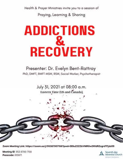 Maria McClean invites us to a session of praying and sharing. Indeed, the director of Health and Prayer Ministries at the Conference is organizing this recurring meeting. Each session takes place on Sabbath, from 8:00 AM to 9:00 AM. This week will be a presentation by Dr. Evelyn Bent-Rattray, PhD, DMFT, RMFT, MSW, RSW, Social Worker, Psychotherapist entitled Addiction and Recovery. You can join by calling (647) 558-0588, or (647) 374-4685, and enter the access code: 953 8700 7158 and password 610871. You may also use the link Zoom link.
