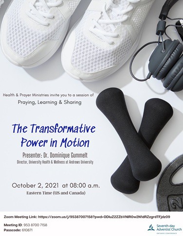 Maria McClean invites us to a session of praying and sharing. Indeed, the director of Health and Prayer Ministries at the Conference is organizing this recurring meeting. Each session takes place on Sabbath, from 8:00 AM to 9:00 AM. This week will be a presentation by Dr. Dominique Gummelt, Director, University Health & Wellness at Andrews University entitled The Transformative Power in Motion. You can join by calling (647) 558-0588, or (647) 374-4685, and enter the access code: 953 8700 7158 and password 610871. You may also use the link Zoom link.