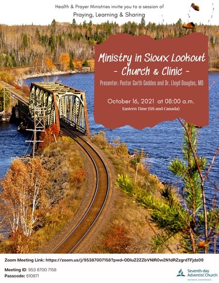 Maria McClean invites us to a session of praying and sharing. Indeed, the director of Health and Prayer Ministries at the Conference is organizing this recurring meeting. Each session takes place on Sabbath, from 8:00 AM to 9:00 AM. This week will be a presentation by the pastor and first elder of the Sioux Lookout Adventist Company – Pastor Garth Geddes and Dr. Lloyd Douglas, MD entitled Ministry in Sioux Lookout – Church and Clinic. You can join by calling (647) 558-0588, or (647) 374-4685, and enter the access code: 953 8700 7158 and password 610871. You may also use the link Zoom link.