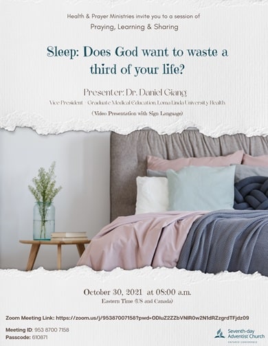 Maria McClean invites us to a session of praying and sharing. Indeed, the director of Health and Prayer Ministries at the Conference is organizing this recurring meeting. Each session takes place on Sabbath, from 8:00 AM to 9:00 AM. This week will be a presentation by Dr. Daniel Giang, Vice President – Graduate Medical Education, Loma Linda University Health entitled Sleep: Does God want to waste a third of your life?. You can join by calling (647) 558-0588, or (647) 374-4685, and enter the access code: 953 8700 7158 and password 610871. You may also use the link Zoom link.