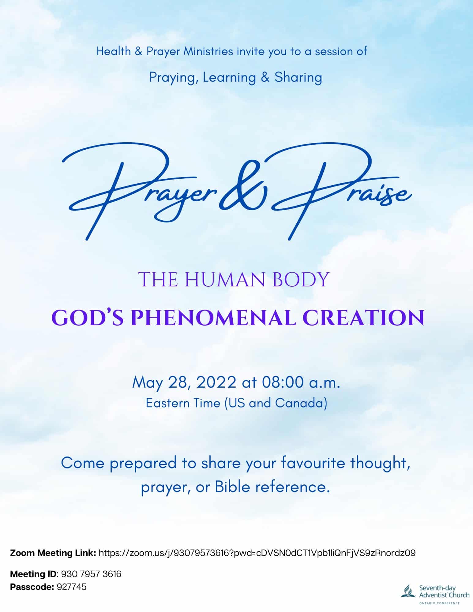 Maria McClean invites us to a session of praying and sharing. Indeed, the director of Health and Prayer Ministries at the Conference is organizing this recurring meeting. Each session takes place on Sabbath, from 8:00 AM to 9:00 AM. This week will be a presentation on PRAYER AND PRAISE with a focus on THE HUMAN BODY – GOD’S PHENOMENAL CREATION. You can join by calling (647) 558-0588, or (647) 374-4685, and enter the access code: 930 7957 3616 and password 927745. You may also use the link Zoom link.