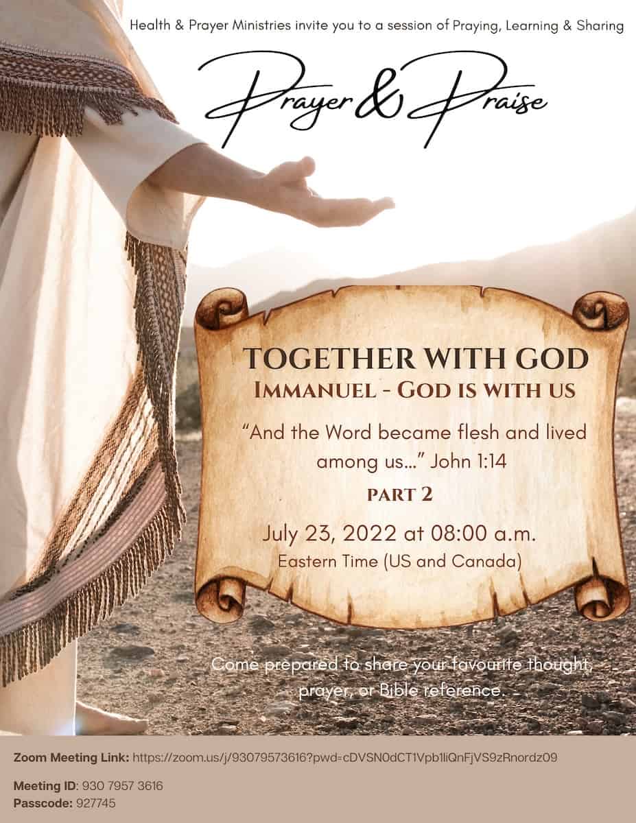 The Health and Prayer Ministries of the Ontario Conference invites us to a session of praying and sharing. This week, there will be a presentation on Immanuel – God is with us. . You can join by calling (647) 558-0588, or (647) 374-4685, and enter the access code: 930 7957 3616 and password 927745. You may also use the link Zoom link.