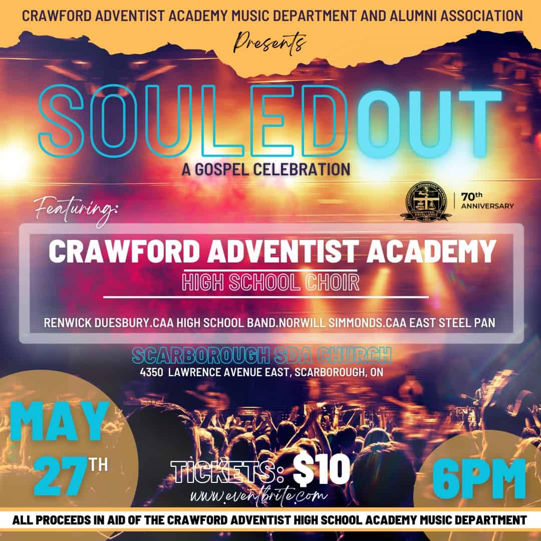 In the evening, the CAA Music Dept. + Alumni Assoc. is hosting A Gospel Celebration: SOULED OUT at the Scarborough Seventh-day Adventist Church. This concert will feature the high school choir, band, CAAE steel pans, and artists. Get your tickets today – you do not want to miss this evening of music and fellowship as we mark 70 Years of Adventist Education at CAA. Proceeds will benefit the CAA Music Dept. Please invite your family and friends!