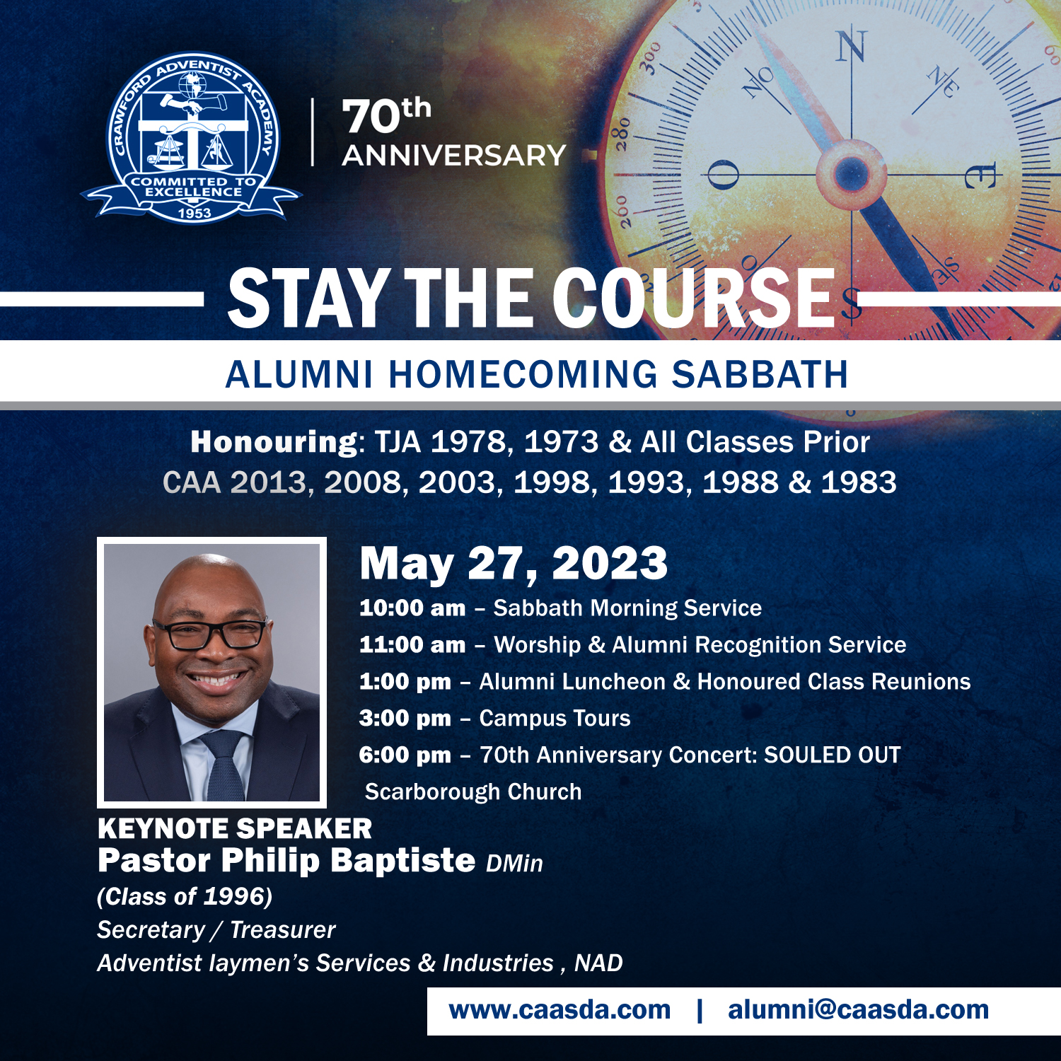 On Sabbath, May 27, 2023, the Worship & Alumni Recognition Service speaker will be Pastor Philip Baptiste (CAA Class of ’96) – the current Secretary/Treasurer of Adventist-laymen’s Services & Industries (ASI), North American Division of Seventh-day Adventists.