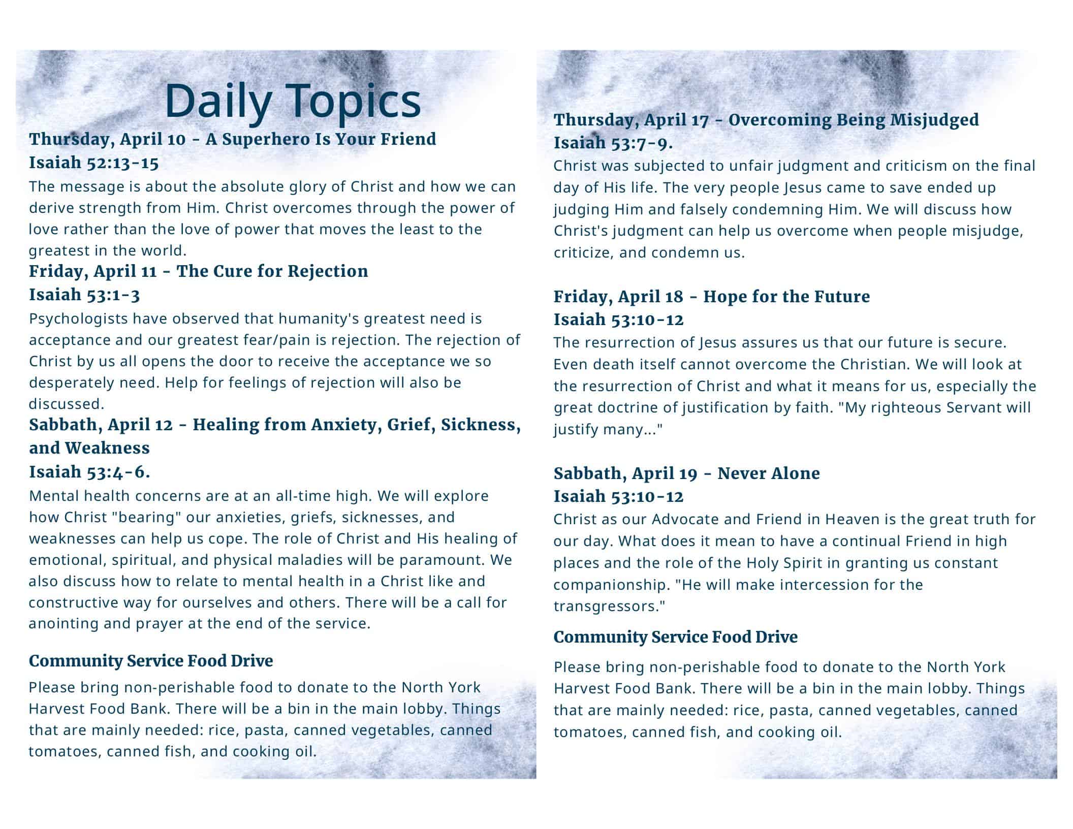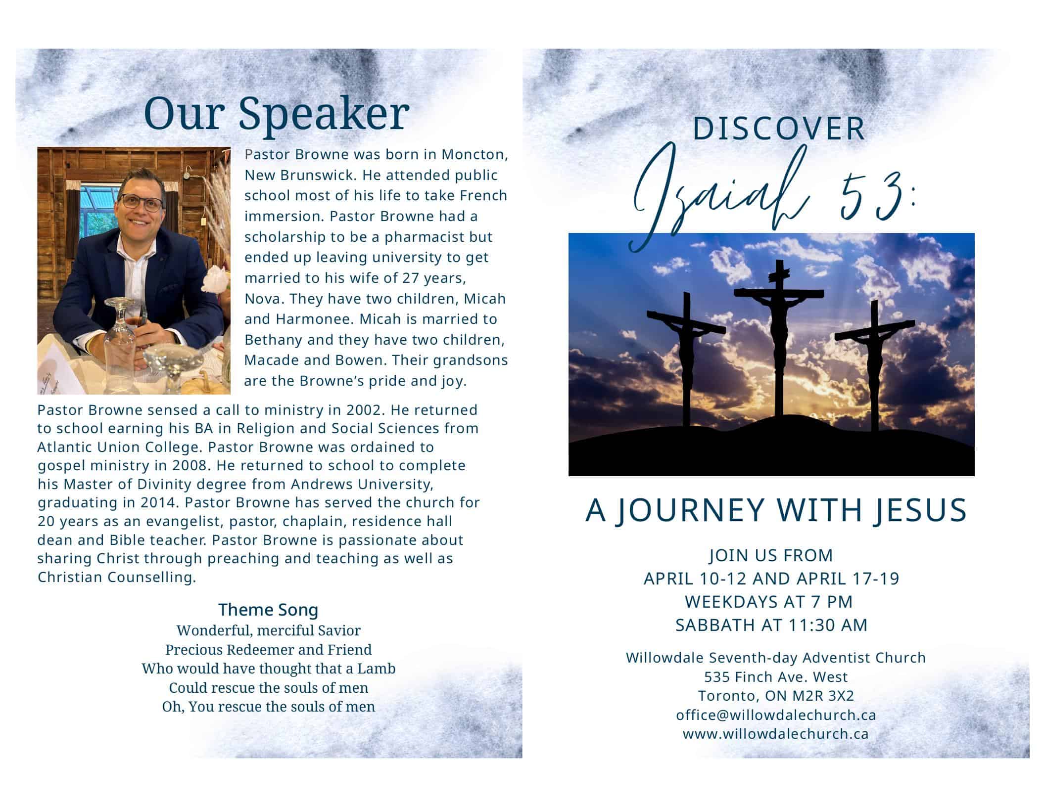 Willowdale will host an evangelistic series between April 10 and 12 and between April 17 and 19. On weekdays, it will take place at 07:00 p.m., and at 11:30 p.m. on Sabbaths.