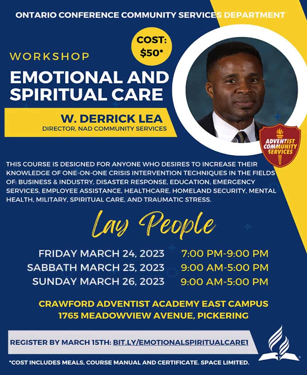 The Emotional and Spiritual Care Workshop is a course designed for anyone who desires to increase their knowledge of one-on-one crisis intervention techniques in the fields of Business & Industry, Crisis Intervention, Disaster Response, Education, Emergency Services, Employee Assistance, Healthcare, Homeland Security, Mental Health, Military, Spiritual Care, and Traumatic Stress. It will be taught by W. Derrick Lea, Director, NAD Community Services.