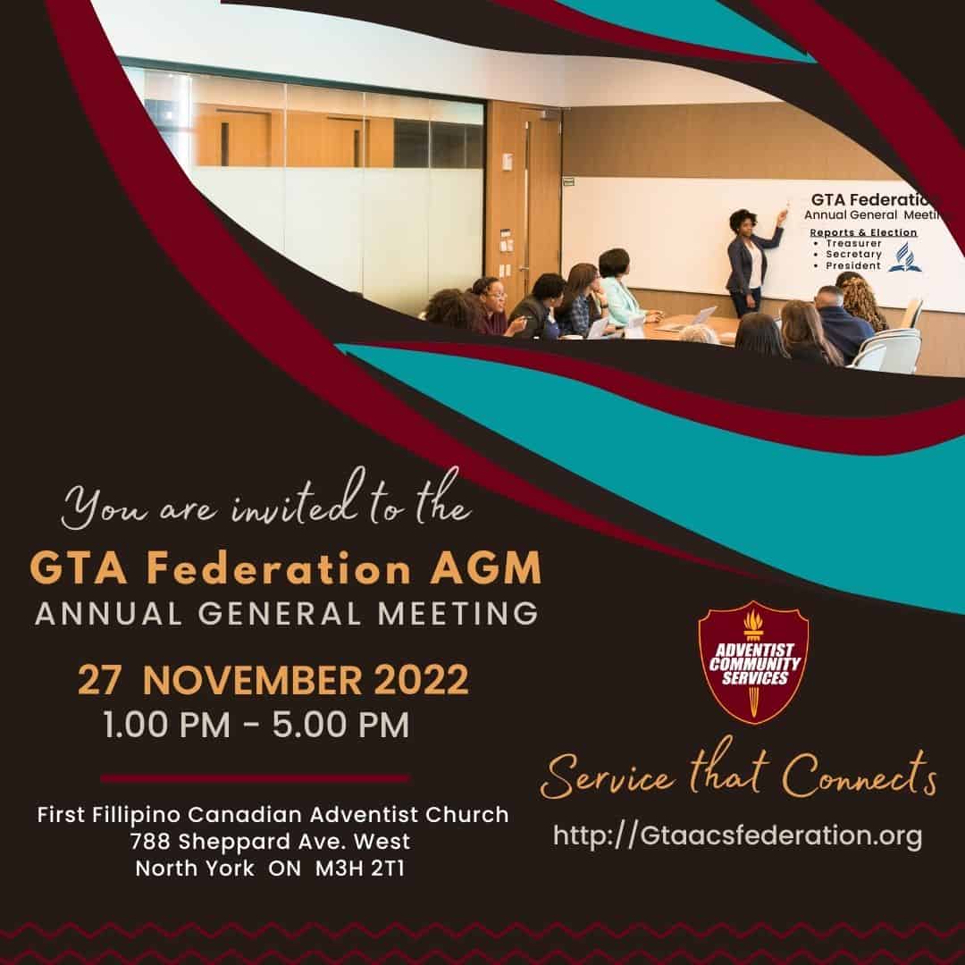 GTA Community Services Federation’s Working Policy states, “Elections shall be held at the time of the last meeting in the fall, every second year.” Therefore, the election of officers for the GTA federation for the next 2 years is fast approaching. I am hereby inviting you, your fellow Community Services officers, and church members to the GTAACS Federation election of officers on Sunday, November 27, 2022, from 1:00 pm to 5:00 pm, at First Filipino-Canadian Seventh-day Adventist Church. More information is in the letter below.
