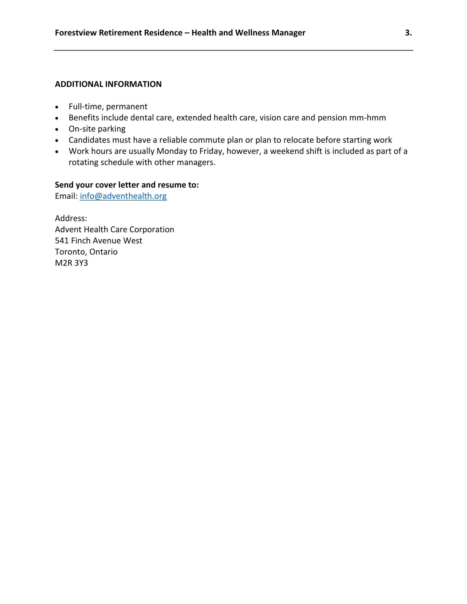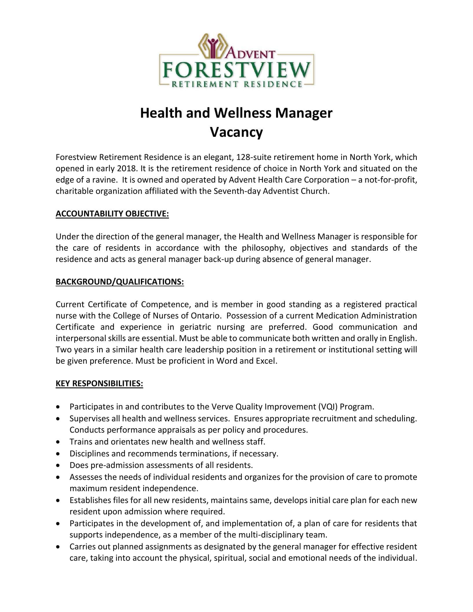 Job Offer: Health and Wellness Manager at Forestview