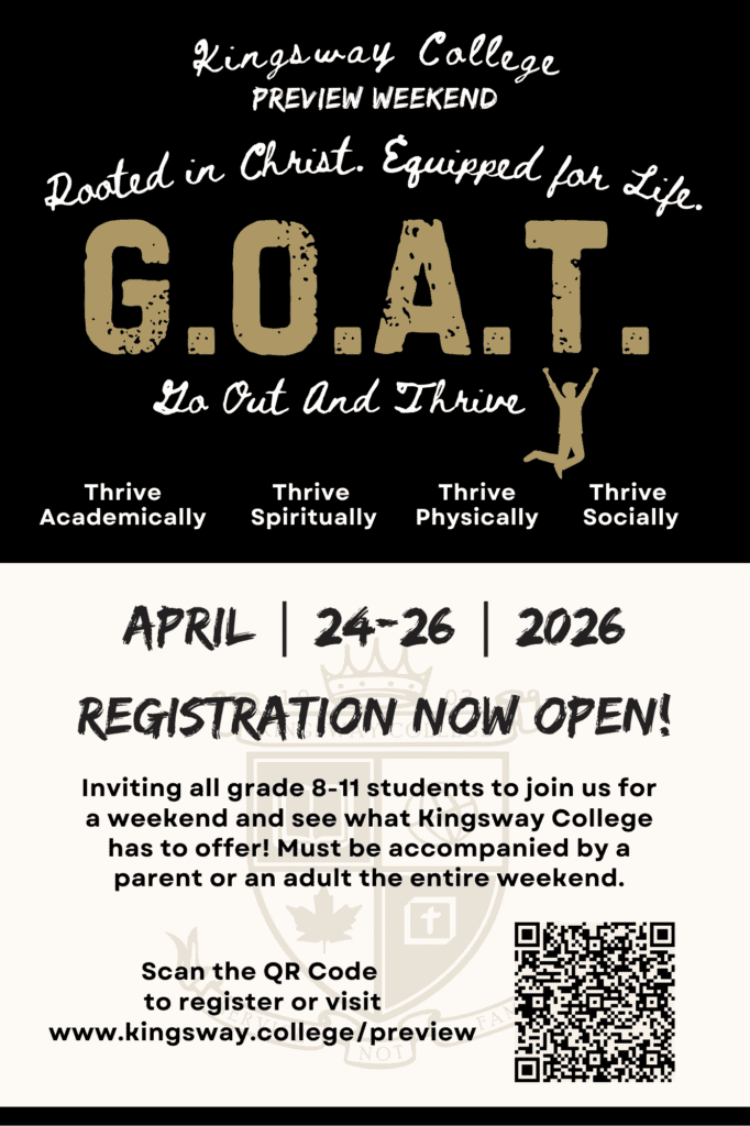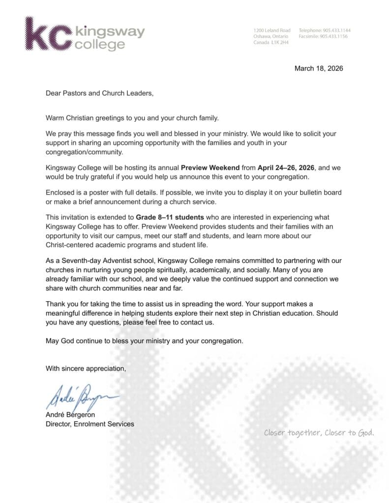Kingsway College, a Seventh-day Adventist boarding and day high school in Oshawa, will be hosting its annual Preview Weekend (Open House) on April 24–26, 2026. This event invites Grade 8–11 students and their families to visit its campus, meet staff and students, and learn more about our Christ-centered academic programs and student life.