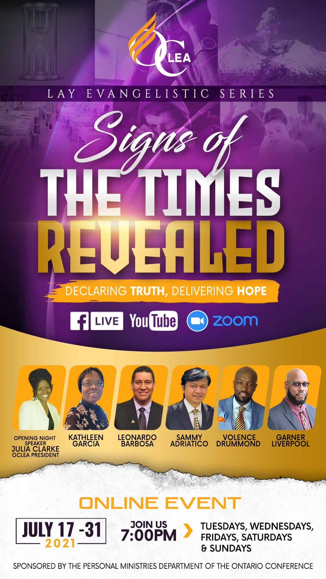 The Ontario Conference Lay Evangelism Association (OCLEA) will hold a series of evangelistic meetings on Zoom from July 17 to 31. The Zoom information is: