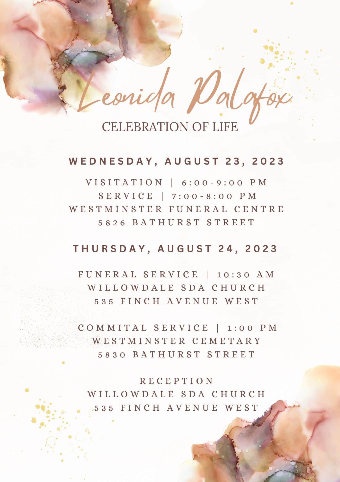 The Willowdale Church family announces the passing of long-time member Leonida Palafox on Friday, August 11, 2023. We extend condolences, especially to her husband Federico, as well as to all of the Palafox and Cudanin families.