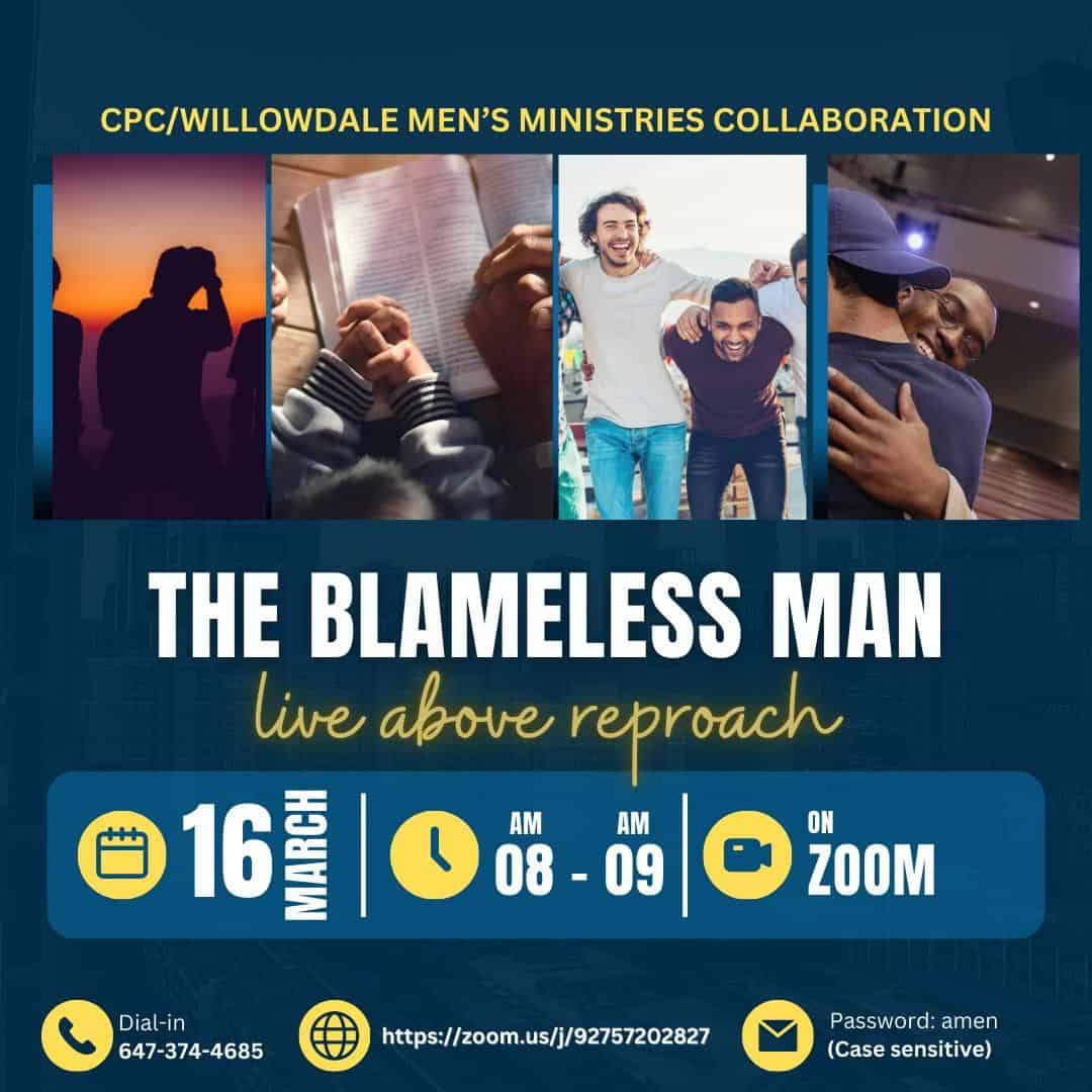 The Men’s Ministries of Willowdale and College Park are collaborating on a new initiative called “The Blameless Man – Live Above Reproach”. It will take place on Zoom on March 16, 2025, between 8:00 a.m. and 9:00 a.m.