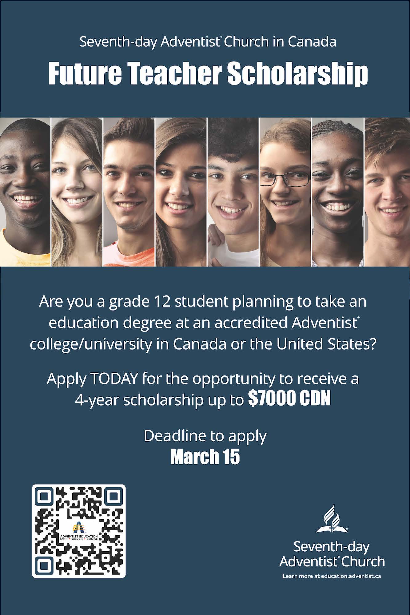 The Seventh-day Adventist Church in Canada will be awarding five Future Teacher Scholarships to high school graduates who enroll in a teacher education degree program at an accredited Adventist college/university in Canada or the USA. Students can apply to receive up to $7000 CDN over 4 years. Applications must be received by March 15, 2023. For more information, please see https://education.adventist.ca/resources/awards-and-scholarships/?tabid=3.