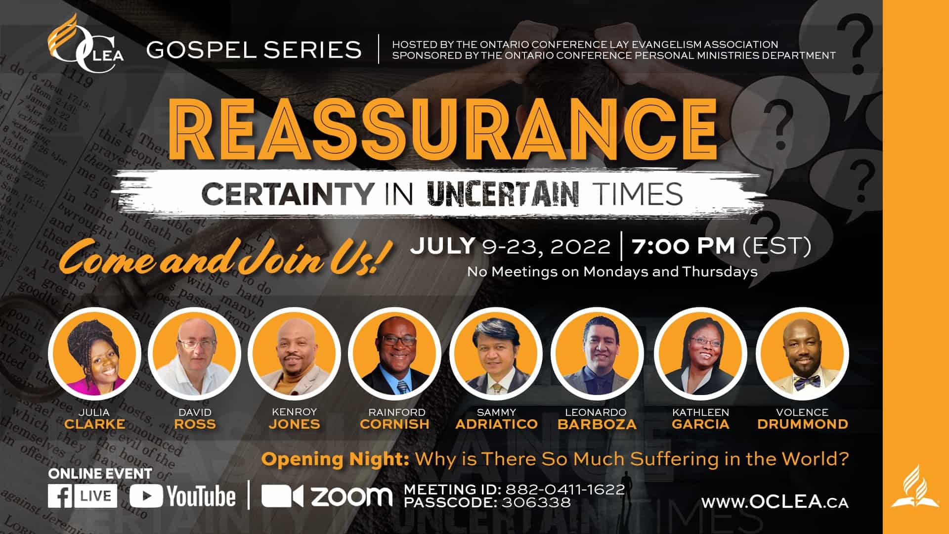OCLEA Evangelism – Reassurance July 6, 2022 1451 TagsOntario Conference of the Seventh-day Adventist ChurchPersonal Ministries Children’s Worship Bulletins – Sabbath, May 02, 2026 April 27, 2026 The Lay Evangelism series will begin on July 9. These are lay individuals which have completed the School of Evangelism and are excited to share the gospel of Jesus Christ. The theme is; REASSURANCE Certainty in Uncertain Times. Adventist News Network Montemorelos University Signs Organ Donation Agreement, Inspires Compassion Through MusicNepal Adventist Leaders, Families Meet for Reflection and Renewal FacebookXLinkedinEmailPrint Previous articleSabbath, July 09, 2022 – Live Stream, Program, BulletinNext articleConference Morning Prayer Session – Sabbath , July 9, 2022